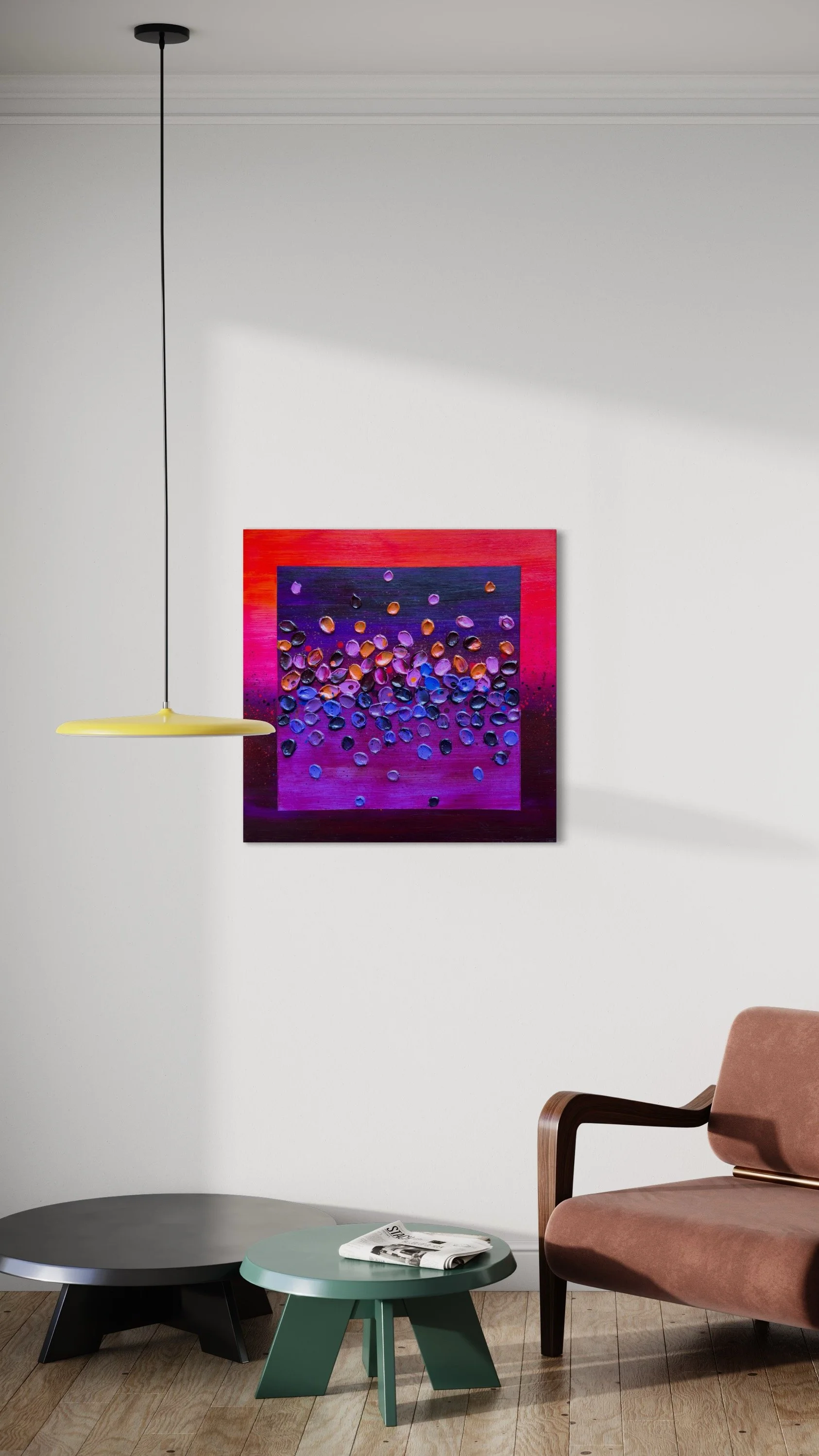 While we don't have a virtual room setting feature, you can view more behind-the-scenes content and see the artwork in various settings on my Instagram.